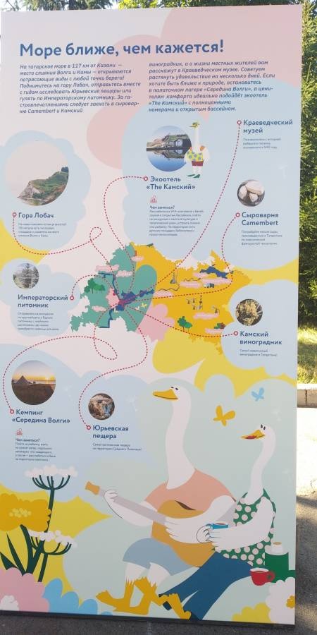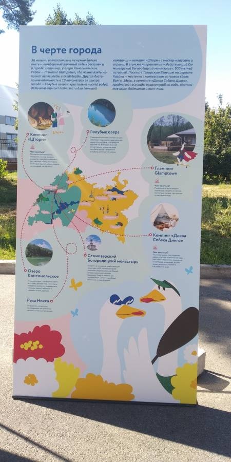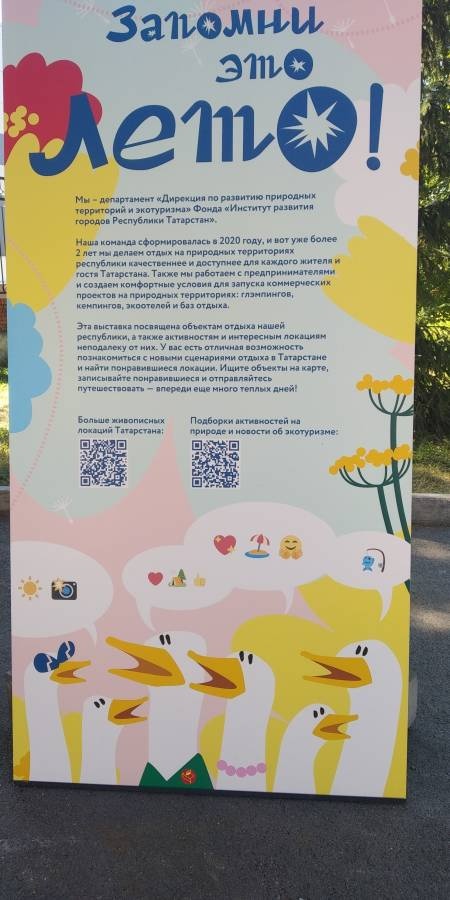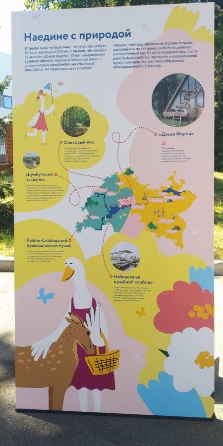 Вот такая интересная идея- передвижная выставка в парке Горького!!! На выставке обозначены места республики, обустроенные для отдыха – глэмпинги, кемпинги и экоотели. А также необычные маршруты для поездок по Татарстану В парке Горького выставка будет работать с 19 по 31 августа, с 1 по 14 сентября экспозиция будет размещена в Горкинско-Ометьевском лесу, а с 15 по 30 сентября – в парке им.Урицкого.