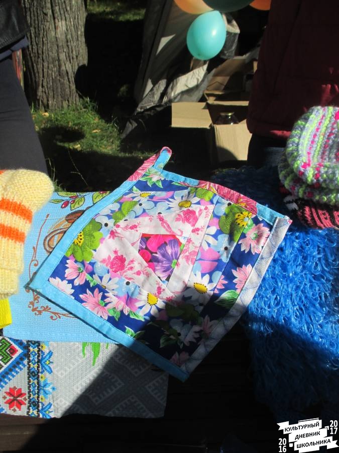 На ярмарке я видела свои, вернее наши с Абикой поделки. Одну из них, прихватку, мы с Абикой сразу продали одной тете. Так хвалили, так хвалили, что она не удержалась и купила.
