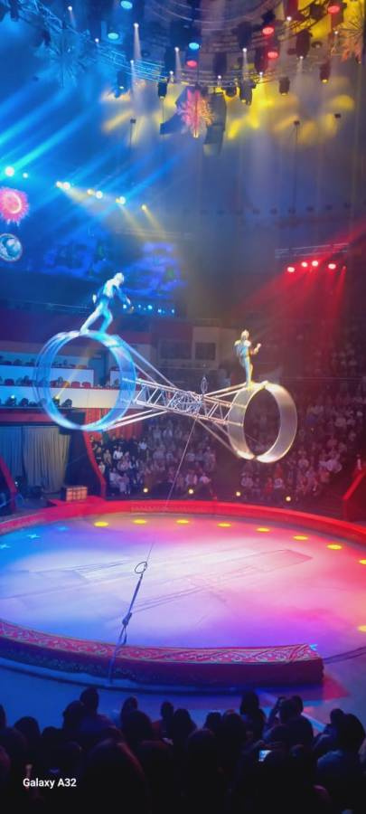 После антракта акробаты в красивых блестящих костюмах забираются в два колеса и устраивают представление. Это Месяц Месяцович и Солнце. Колеса крутятся по кругу,а акробаты бегают и прыгают не только внутри, но и снаружи. У нас захватывало дух.