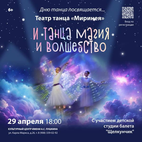 "И танца магия и волшебство". Концерт к международному дню танцаДрузья, в Культурном центре имени А.С. Пушкина праздничная дата — театру танца «Миринея» исполняется 5 лет! К этому знаменательному событию юные артисты театра совместно с участниками детской студии балета «Щелкунчик» подготовили большую хореографическую программу, которая не оставит равнодушным ни одного ценителя искусства движения и пластики. Вас ждёт калейдоскоп ярких номеров: от классических до современных. Каждый танец — это история, рассказанная языком тела, наполненная эмоциями, грацией и вдохновением. Праздничная программа подарит зрителям незабываемые впечатления! Это не просто концерт, а настоящий подарок всем, кто любит и ценит искусство танца. Ждём вас на нашем празднике красоты и движения! Вход по предварительной регистрации: https://centrpushkina.timepad.ru/event/3934853/ Когда?29 апреля в 18:0 Где? Культурный центр имени А.С.Пушкина (ул.Карла Маркса, 26) Подарите себе и близким вечер, наполненный гармонией и искусством!